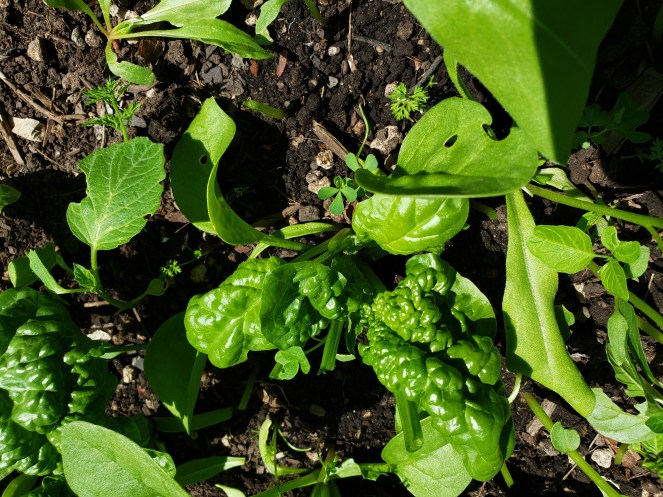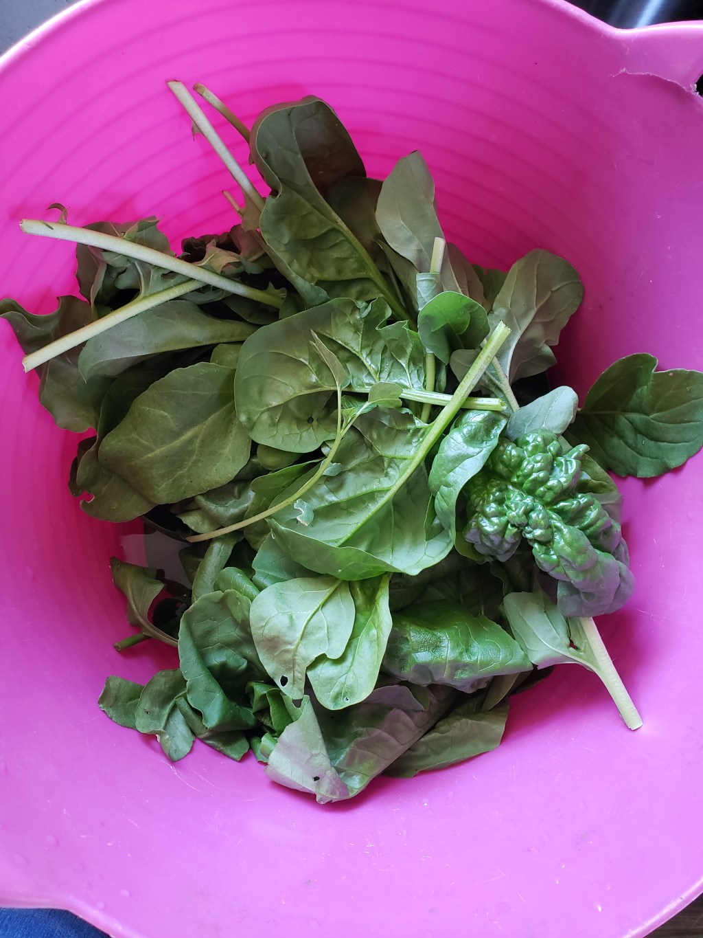 Many leafy greens and a few others can be trimmed over and over again extending the harvest much longer than simply cutting at maturity. (And much easier than succession planting.) For spinach and many loose leaf greens (spinach, arugula, lettuces) trim the larger outer leaves. They grow up from the center and will put out new growth in short order. For tighter lettuces like butter leaf lettuce, I like to cut the whole plant and leave about one inch of the core behind to regrow.