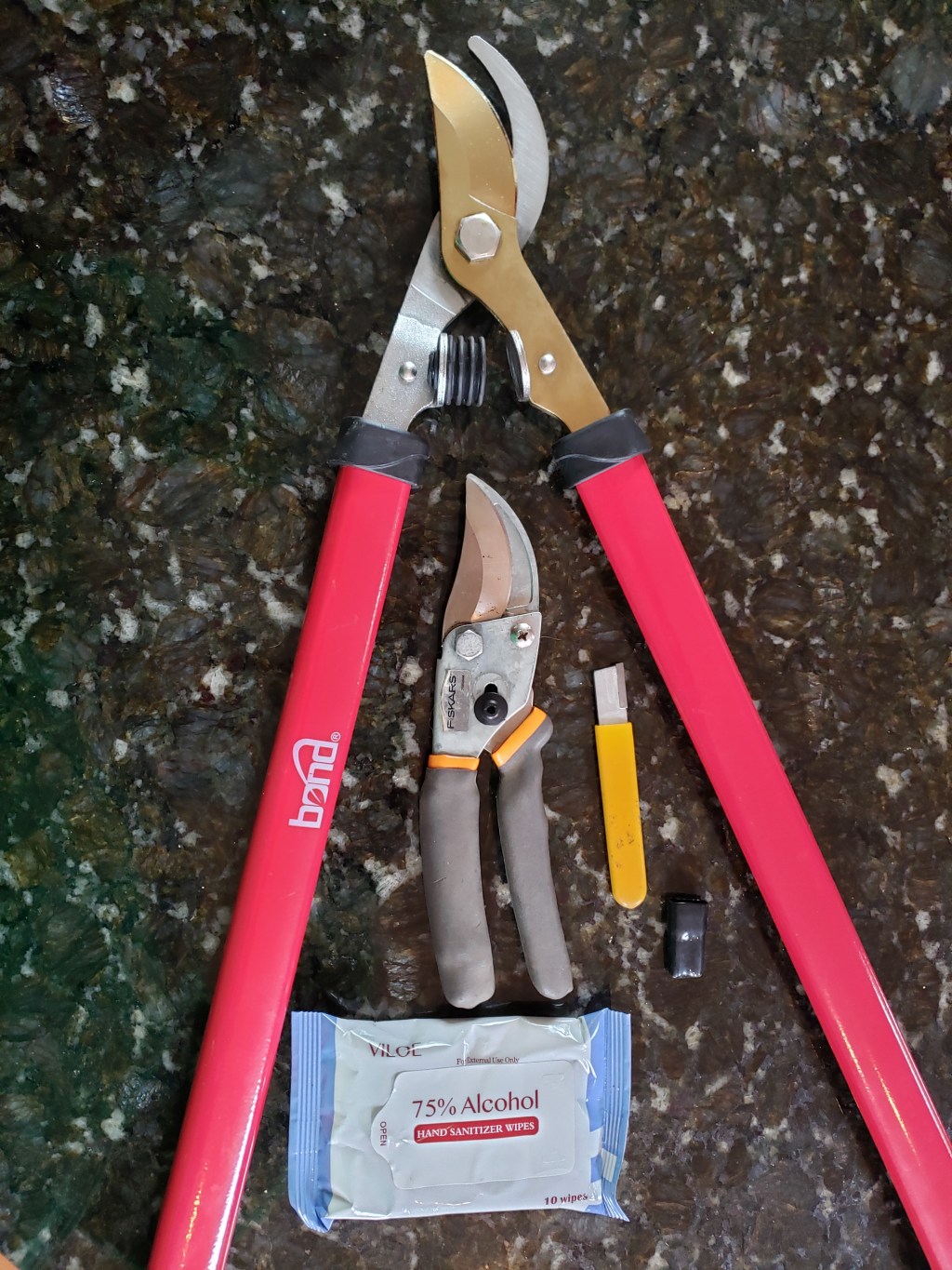 Today, I took advantage of the dry-ish weather to get cutting. First, I pruned back and shaped the table grapes. I saved some of the lower cuttings for propagating for a friend. The branches nearest to the ground generally have more natural rooting hormone present.
