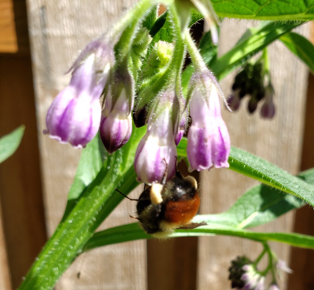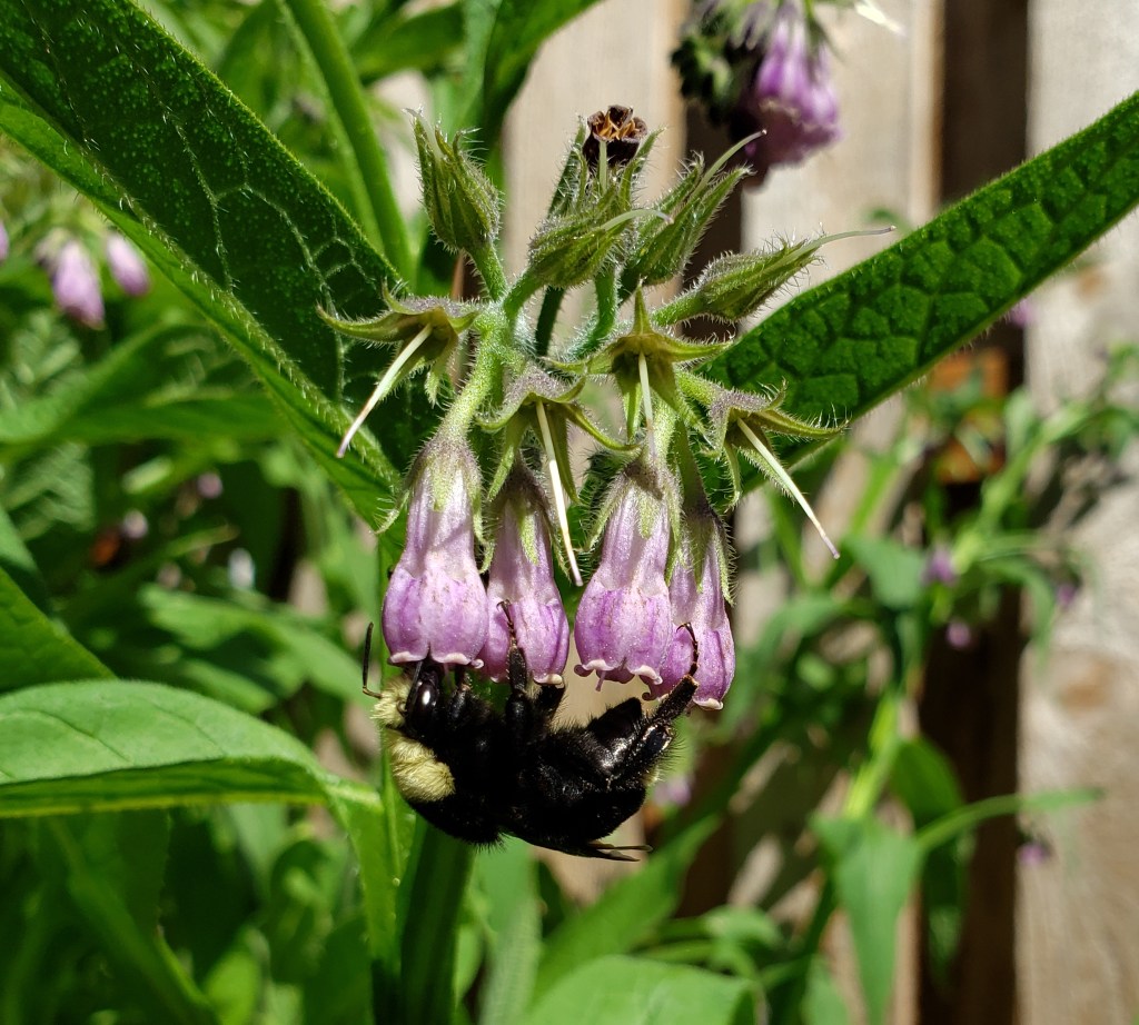 Bumbleebees in particular love my comfrey plant. I have heard it said that native insects prefer native plants–and I’m sure that’s true in general–but when it’s blooming all manner of bumblebee bees of many other bees varieties are on it always.