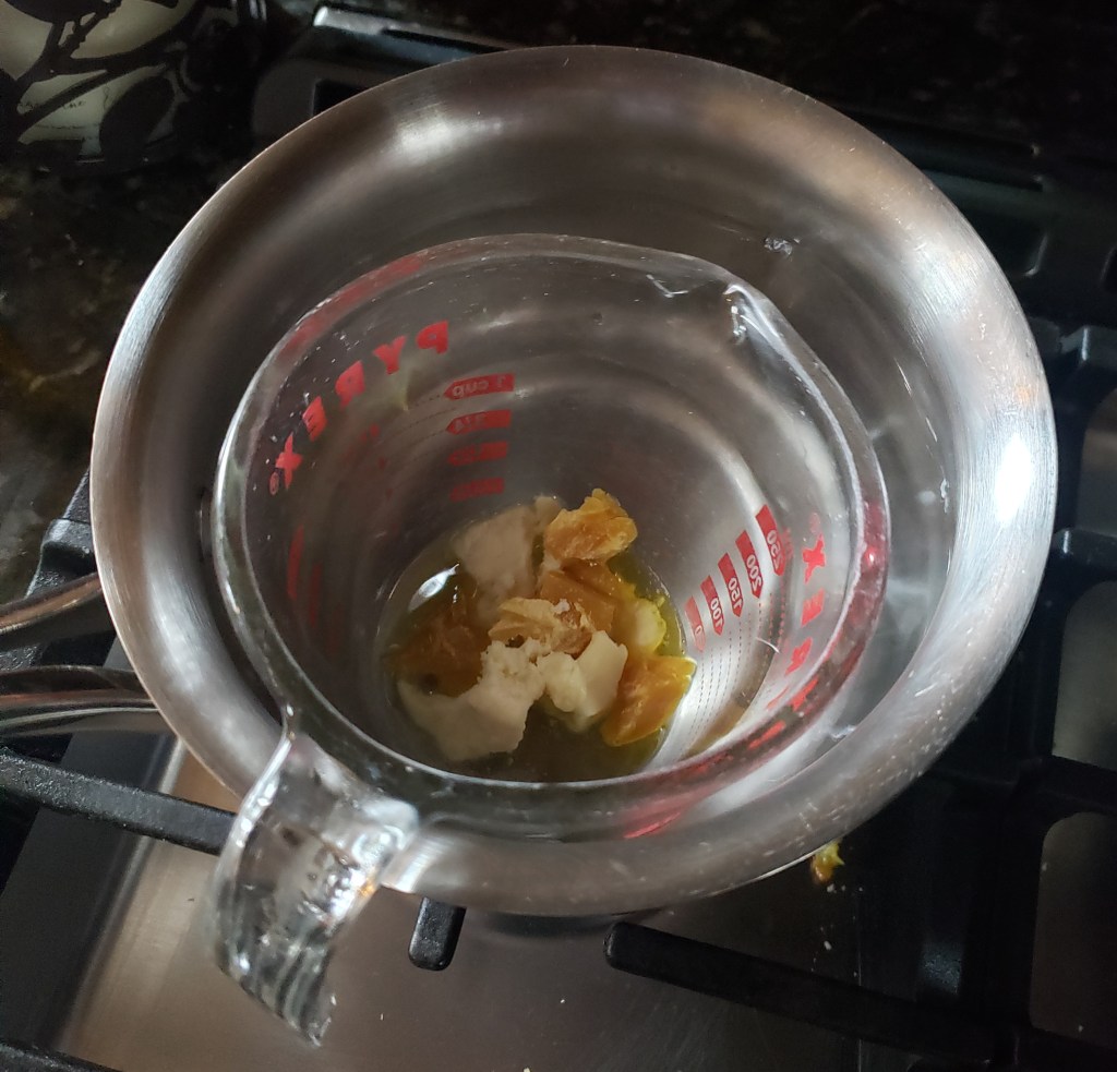 - Using a makeshift double boiler out of a saucepan with water and Pyrex measuring cup, melt the beeswax and shea butter.